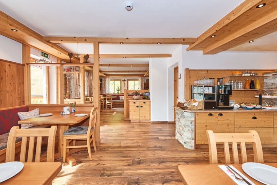 Unser neu errichteter Frühstücksraum mit gemütlicher Atmosphäre bietet viel Platz zum Genießen und Beisammensein. Starten Sie Ihren Urlaubstag mit einem reichhaltigen Frühstück von unserem Frühstücksbuffet mit regionalen und teils sogar selbstgemachten Produkten aus unserer eigenen Landwirtschaft. Im Sommer und auch im Frühjahr, sobald es die Temperaturen zulassen, können Sie das Frühstück auch auf unserer großen Terrasse im Freien genießen. So starten Sie gestärkt in einen aktiven Urlaubstag!